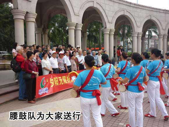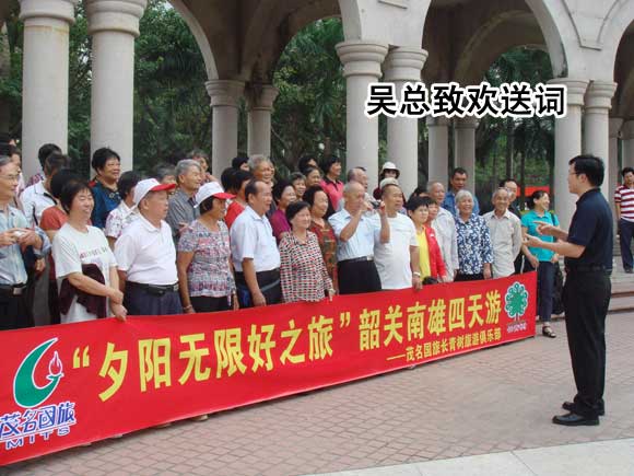 10月22日早上,人民廣場(chǎng)東門鑼鼓喧天,熱鬧非凡,茂名國(guó)旅長(zhǎng)青樹(shù)旅游俱樂(lè)部“夕陽(yáng)無(wú)限好之旅”啟動(dòng)儀式在這里隆重舉行。茂名電視臺(tái)到現(xiàn)場(chǎng)進(jìn)行了采訪報(bào)道,俱樂(lè)部藝術(shù)團(tuán)的腰鼓隊(duì)敲著快樂(lè)的鼓點(diǎn)《越來(lái)越好》為大家送行。我公司總經(jīng)理吳卡達(dá)、副總經(jīng)理陳國(guó)斌也來(lái)到現(xiàn)場(chǎng)歡送,吳總代表公司致歡送詞。公司還為每一位客人贈(zèng)送了一份精美禮品。