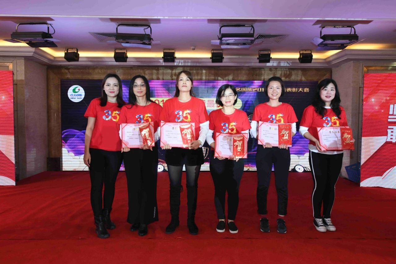 ▲副總經理劉穎為2019年度“優(yōu)秀計調獎”獲得者:羅智武、梁翠霞、陳杏、張小玲(來看海)頒獎