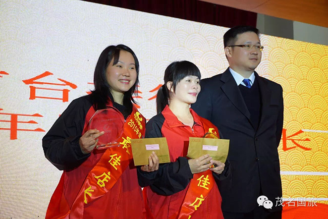 總經(jīng)理吳卡達(dá)為前臺(tái)接待部2015年度最佳店長(zhǎng)蔣綺婷(高州分店)、呂華莉(信宜分店)頒獎(jiǎng)。