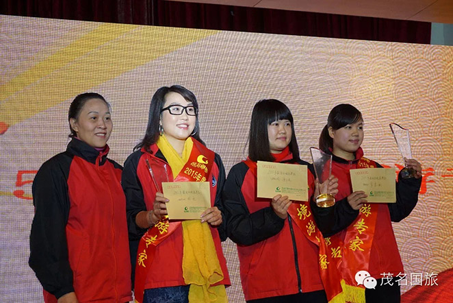 副總經(jīng)理劉穎為2015年度出境游專(zhuān)家獲得者林曉、陳金鳳、李春桃頒獎(jiǎng)