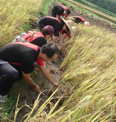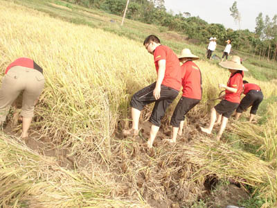 所有人的情緒給提了上來,大家脫掉了鞋子卷起了褲子,為了激發(fā)大家的積極性,我們進(jìn)行了任務(wù)分配。陳俊一聲令下“開始”,大家跳進(jìn)了泥濘的稻田,一字排開展開了收割比賽。大家彎下腰,扎好馬步,一手抓著稻梗,一手握著鐮刀,一揮,“喳喳”,就割了一把稻谷。這樣一來可真是一幅面向黃土背朝天的田間農(nóng)忙景象,連田埂上的老黃牛都瞪住大眼睛,看著這幫紅男綠女出沒在金色的稻田里。