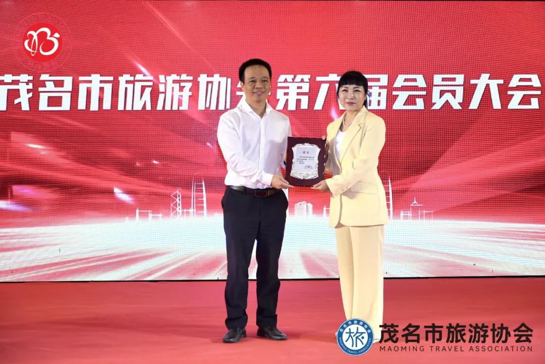 ▲新一屆茂名市旅游協(xié)會(huì)會(huì)長(zhǎng)費(fèi)民龍女士為會(huì)員單位頒發(fā)牌匾
