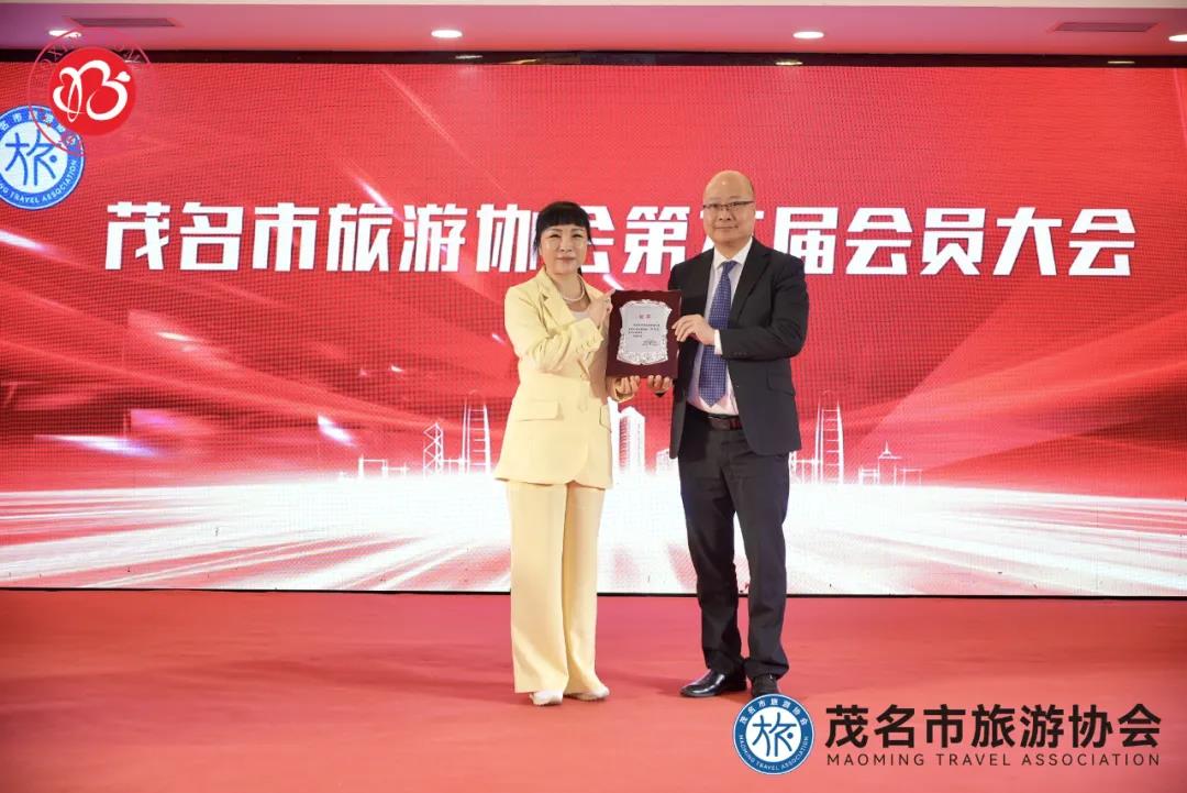 ▲新一屆茂名市旅游協(xié)會(huì)會(huì)長(zhǎng)費(fèi)民龍女士為執(zhí)行會(huì)長(zhǎng)單位頒發(fā)牌匾