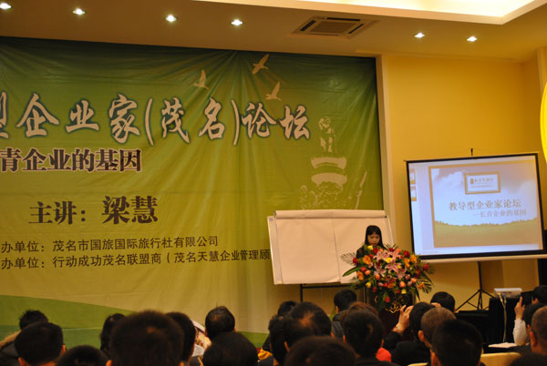 《教導(dǎo)型企業(yè)家茂名論壇》邀請(qǐng)了亞洲最具實(shí)效的行動(dòng)成功國(guó)際教育集團(tuán)的梁慧導(dǎo)師來(lái)茂為廣大企業(yè)家傳經(jīng)送寶,梁慧老師是行動(dòng)成功國(guó)際教育集團(tuán)核心講師、長(zhǎng)虹多媒體產(chǎn)業(yè)公司首席發(fā)展顧問(wèn)等,曾為長(zhǎng)虹集團(tuán)、中國(guó)電信、工商銀行、奔馳車行等百家企業(yè)提供內(nèi)訓(xùn),其主講的《教導(dǎo)型企業(yè)家論壇——長(zhǎng)青企業(yè)的基因》課程,為企業(yè)建立了一套基業(yè)長(zhǎng)青的落地系統(tǒng)方案。很多參與本次論壇的企業(yè)家都認(rèn)為這次學(xué)習(xí)機(jī)會(huì)很難得,通過(guò)學(xué)習(xí),產(chǎn)生了很多經(jīng)營(yíng)管理上啟發(fā)和靈感,收獲很大。