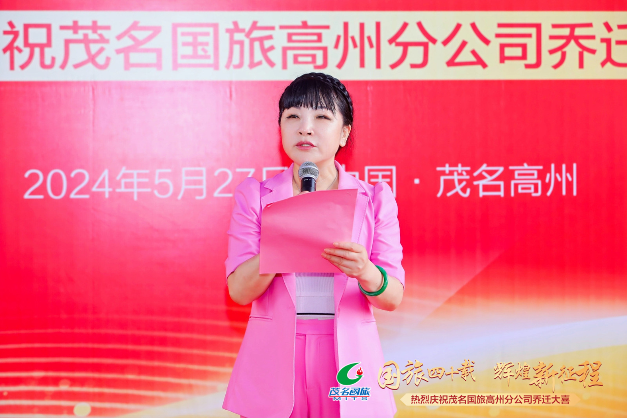 隨后,茂名國旅高州分公司總經(jīng)理陳柳嬋登臺講話。她說,茂名國旅高州分公司從2001年成立,至今已經(jīng)走過了23個春秋,在扎根高州的20多年里,茂名國旅高州分公司能夠取得一點(diǎn)微不足道的成績,離不開在座各位領(lǐng)導(dǎo)的指導(dǎo)與支持,離不開各位同行同事的幫助與照顧,離不開各位親朋好友的鼓勵和厚愛。在新的工作環(huán)境中,我們將以嶄新的姿態(tài)和更高的要求,扎實(shí)苦干、開拓創(chuàng)新,把一流的辦公條件轉(zhuǎn)化為一流的經(jīng)營管理、一流的品牌形象、一流的發(fā)展業(yè)績。