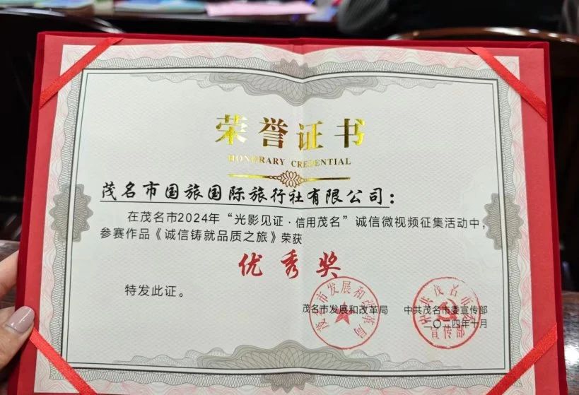 茂名國旅作品《誠信鑄就品質(zhì)之旅》榮獲2024年“光影見證·信用茂名”誠信微視頻征集活動優(yōu)秀獎