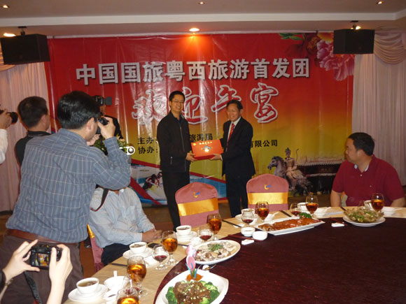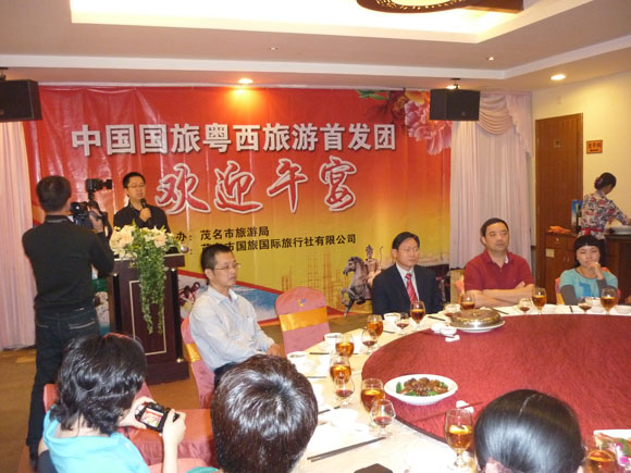10月31日中午,中國國旅粵西旅游首發(fā)團抵達茂名。作為首發(fā)團的唯一接待旅行社,我公司在高品味大酒店設宴接待了首發(fā)團的游客,茂名市旅游局局長李清漢出席了歡迎午宴,他在午宴上推介了茂名旅游資源并向首發(fā)團贈送了禮品。