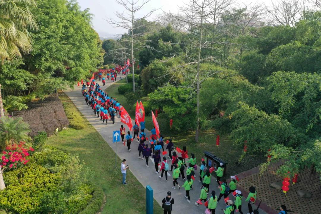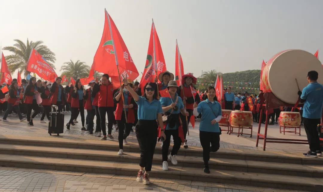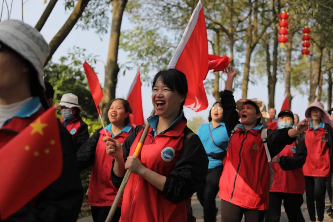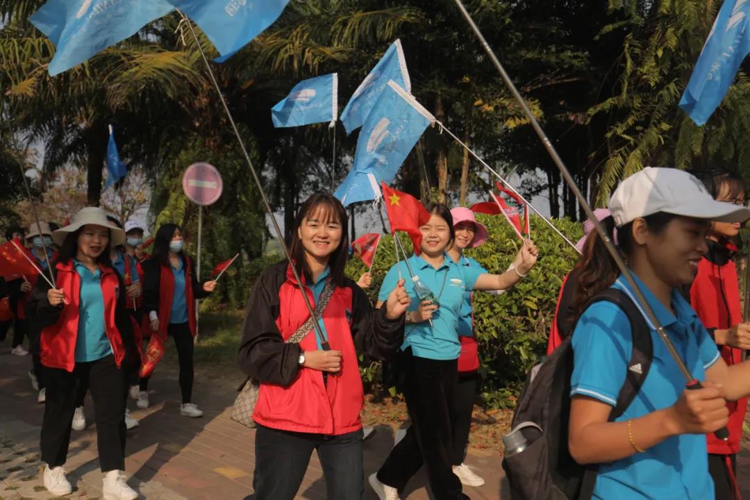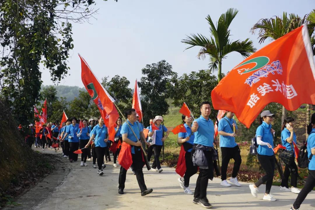 在廣墾公園門口, 公司領(lǐng)導(dǎo)向各徒步方陣授旗, 授旗儀式結(jié)束后, 快樂的徒步開始了! 看看國旅人龐大的團(tuán)隊(duì) 廣墾外圍一圈都是國旅飄揚(yáng)的紅旗!