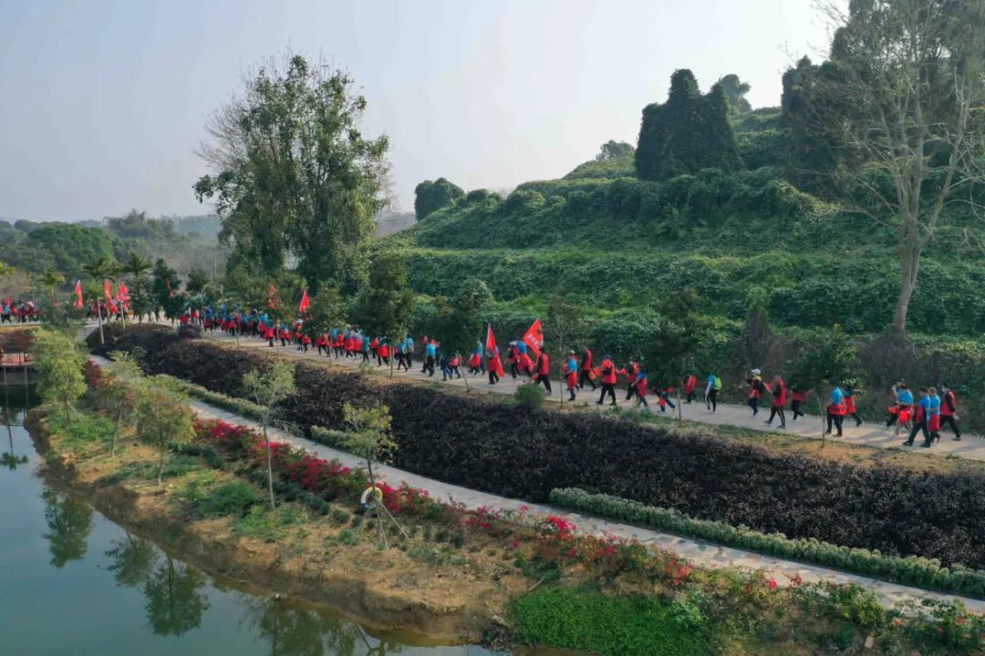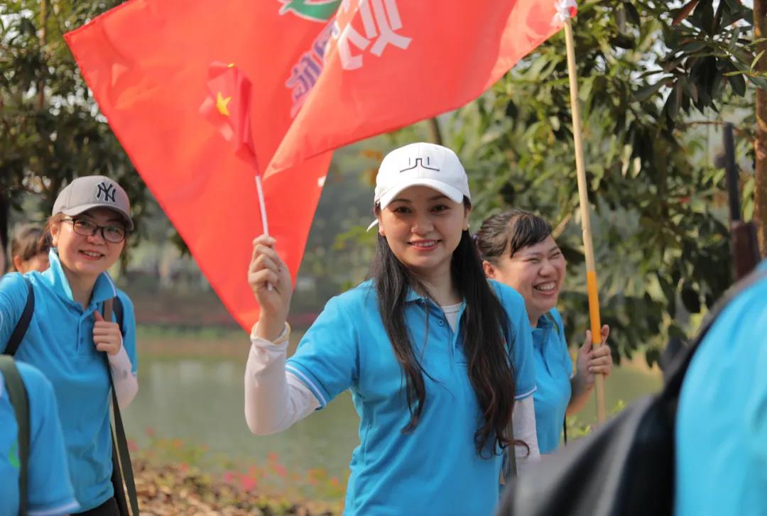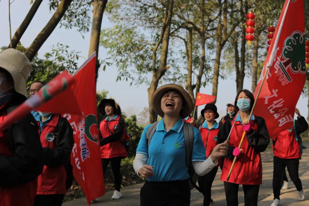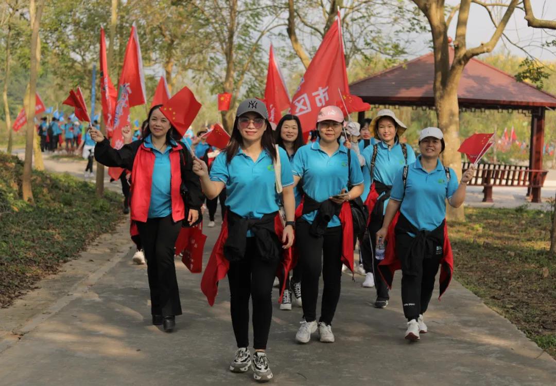 在廣墾公園門口, 公司領(lǐng)導(dǎo)向各徒步方陣授旗, 授旗儀式結(jié)束后, 快樂的徒步開始了! 看看國旅人龐大的團(tuán)隊(duì) 廣墾外圍一圈都是國旅飄揚(yáng)的紅旗!