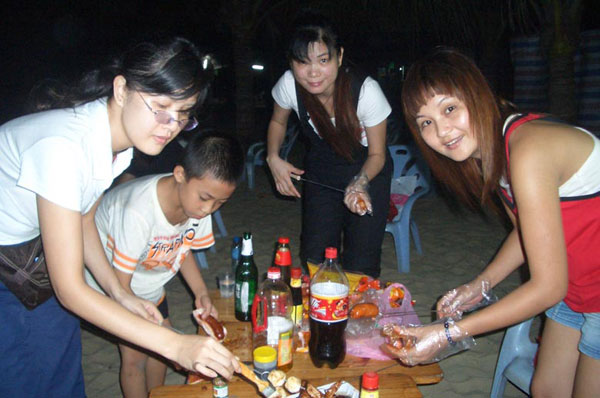 當(dāng)夜幕降臨,我們?cè)谏碁┥先计鹆颂炕?,烘烤晚宴開(kāi)始了!大伙時(shí)而比比誰(shuí)烤的雞翼最有水平,時(shí)而舉杯開(kāi)懷暢飲,人人樂(lè)在其中。在這種和諧的氛圍里,我們抓住這難得的機(jī)會(huì),與幾位員工家屬一起聊起了家常、聊起了旅游,并真誠(chéng)地希望親友們能對(duì)我們的工作給予更大的理解和支持,而家屬們也給予了積極的、熱情的回應(yīng)。