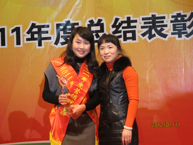 茂名國(guó)旅董事長(zhǎng)費(fèi)民龍女士為“2011年度營(yíng)銷(xiāo)冠軍獎(jiǎng)”林曉經(jīng)理頒獎(jiǎng)