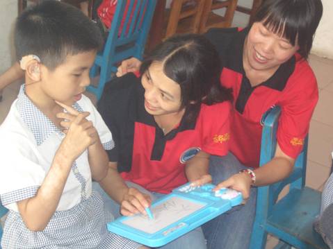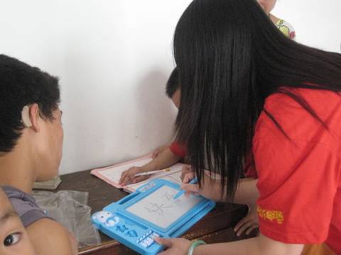 雖然聾啞兒童無法感受到有聲世界的精彩,但他們同樣充滿活力、渴求知識,以樂觀態(tài)度在無聲中尋找生活的快樂。我們送來了非常便于小朋友學字的磁性寫字板,這成為了我們溝通信息的很好媒介,文字來往穿梭于靜謐與喧嘻之間,傳遞著有聲世界的親切問候、承載著無聲世界的熱情回應。