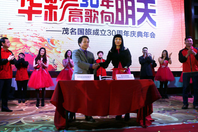 年會(huì)精彩繼續(xù),市企業(yè)家協(xié)會(huì)會(huì)長(zhǎng)陳明強(qiáng)代表協(xié)會(huì)現(xiàn)場(chǎng)與茂名國(guó)旅簽訂戰(zhàn)略合作協(xié)議;