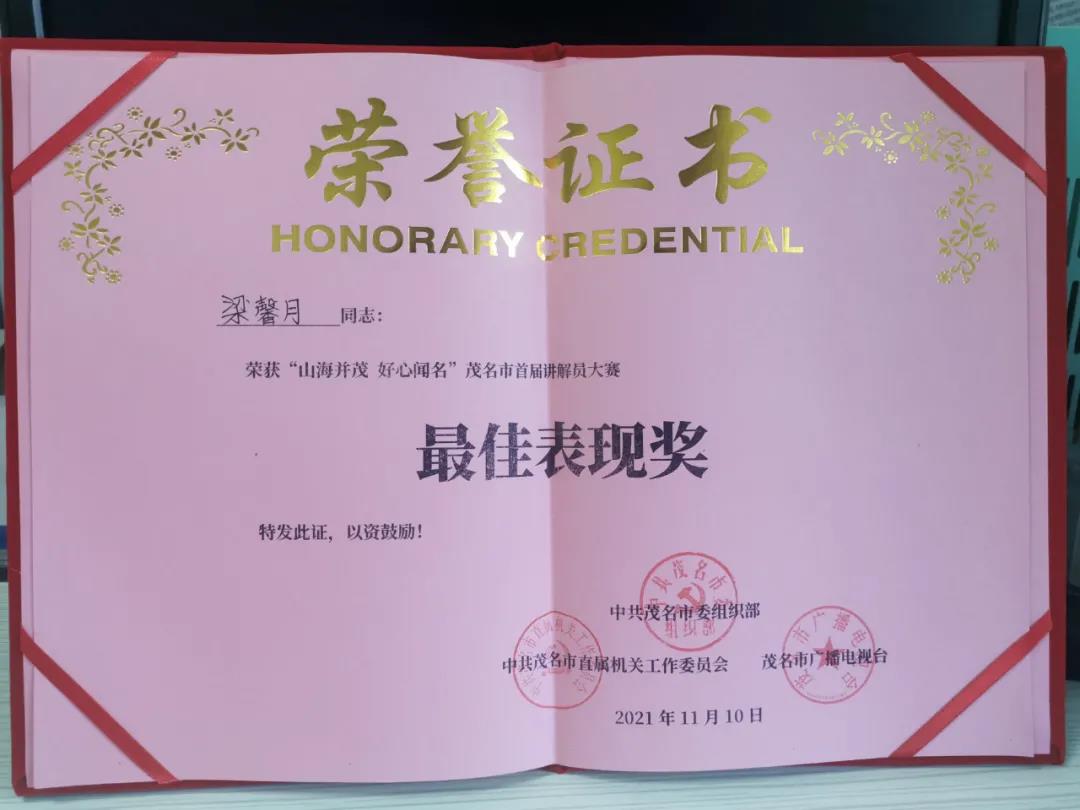 我社導(dǎo)游梁馨月在茂名市首屆講解員大賽中榮獲兩項(xiàng)大獎(jiǎng)!