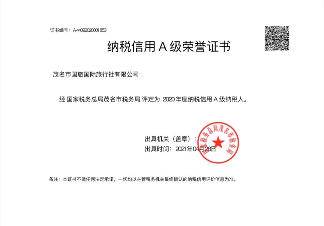 4月28日,我社被國家稅務(wù)總局茂名市稅務(wù)局授予“納稅信用A級榮譽證書”。