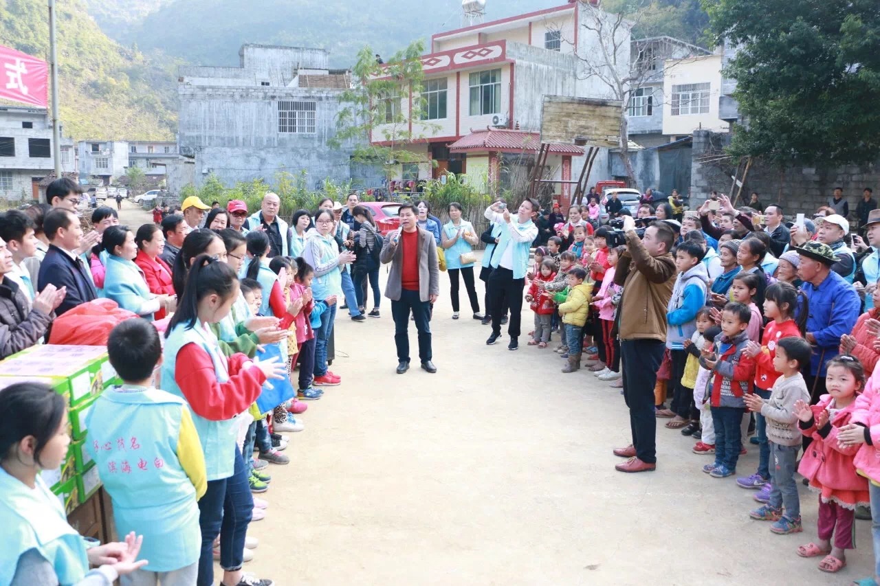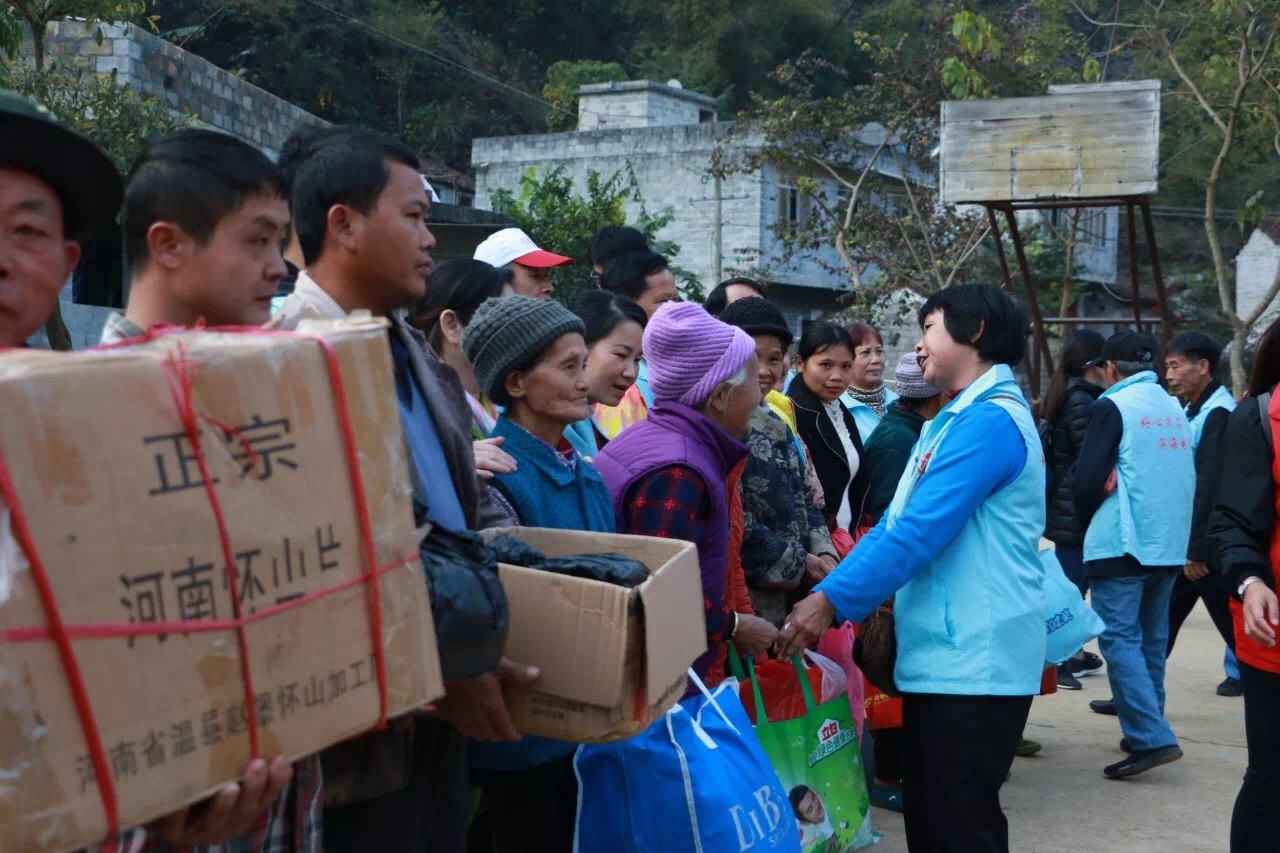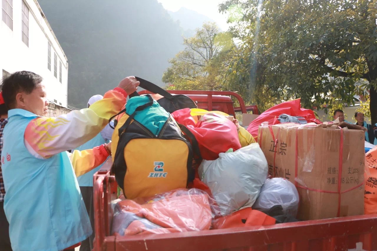 由于去往捐獻地民族村的山路狹窄,大巴車無法駛入,大家紛紛下車裝上物資,徒步進山。
