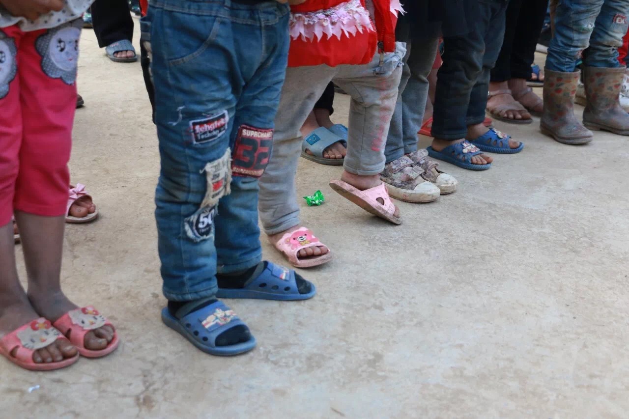 讓人揪心和難受的是這里的孩子們,山里的冬天溫度很低,他們身上穿著別人送的舊棉襖,但是每雙小腳都只是一雙拖鞋、涼鞋或膠鞋。