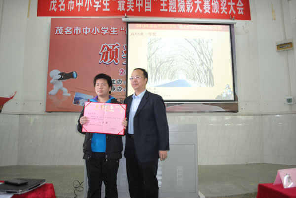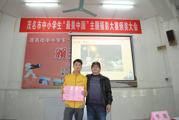 茂名市攝影家協(xié)會主席彭永強先生為高中組二等獎獲得者頒獎