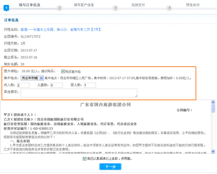 填寫集中地點、人數(shù)、需求,打勾《旅游組團合同》,然后點擊【下一步】