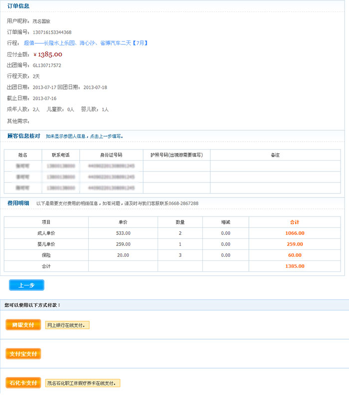 核對訂單信息、顧客信息、如果想修改,點擊【上一步】,信息無誤,選擇支付方式