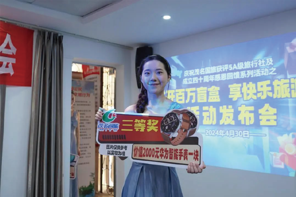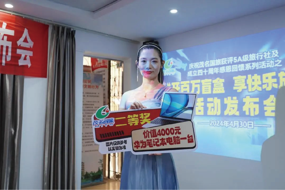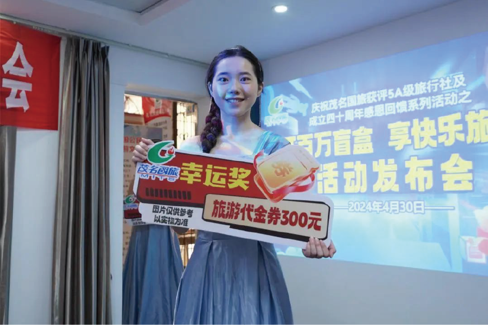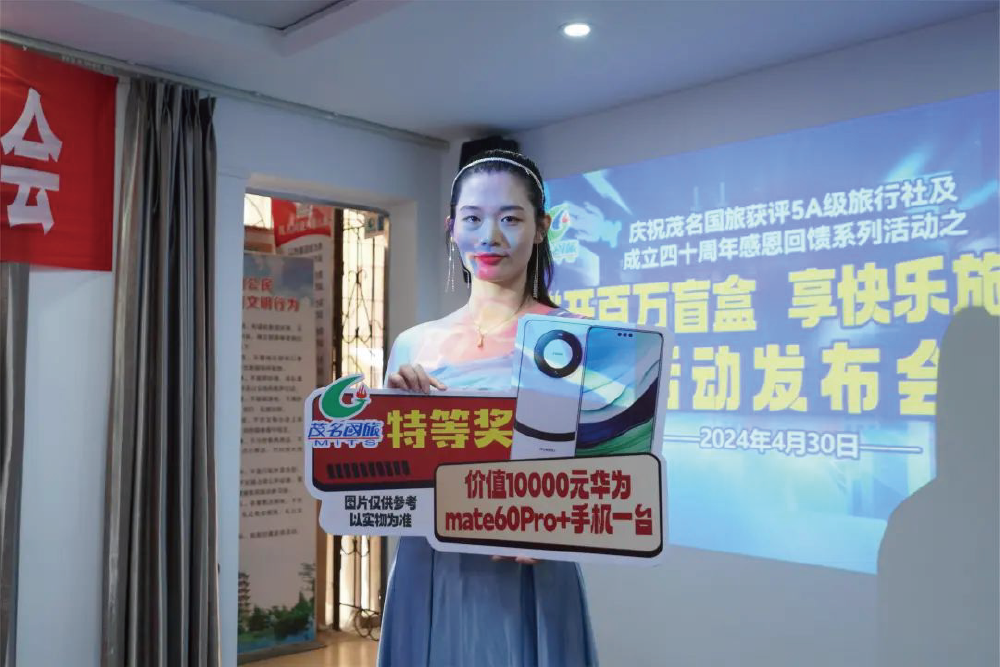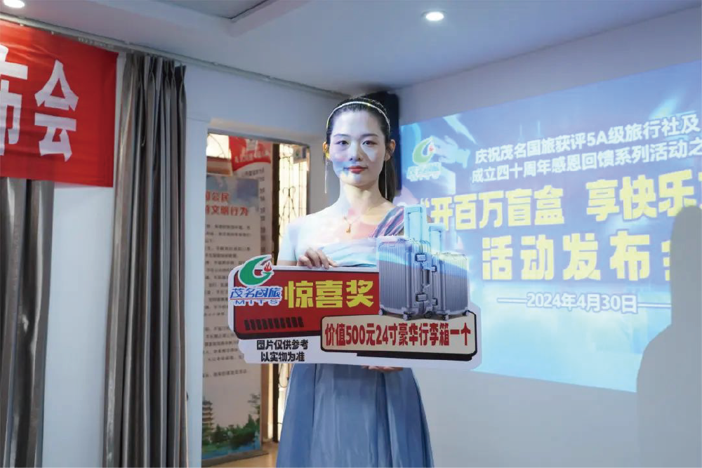 2024年,對(duì)茂名國(guó)旅來說是值得驕傲和自豪的一年,今年1月份,茂名國(guó)旅榮耀獲評(píng)廣東省首批5A級(jí)旅行社。2024年,是茂名國(guó)旅發(fā)展史上具有里程碑意義的一年,今年是茂名國(guó)旅成立四十周年。為感謝廣大游客一直以來的信任和支持,茂名國(guó)旅今年策劃推出了“慶祝茂名國(guó)旅獲評(píng)5A級(jí)旅行社及成立四十周年感恩系列活動(dòng)”,“開百萬盲盒 享快樂旅游”活動(dòng)就是其中一項(xiàng)活動(dòng)。
