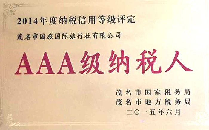 2015年6月,經(jīng)茂名市國家稅務(wù)局、地方稅務(wù)局納稅信用等級(jí)評(píng)審委員會(huì)評(píng)定,并報(bào)廣東省國稅局、地稅局備案,茂名市國旅國際旅行社有限公司被評(píng)定為“茂名市2014年度納稅信用AAA級(jí)納稅人”。