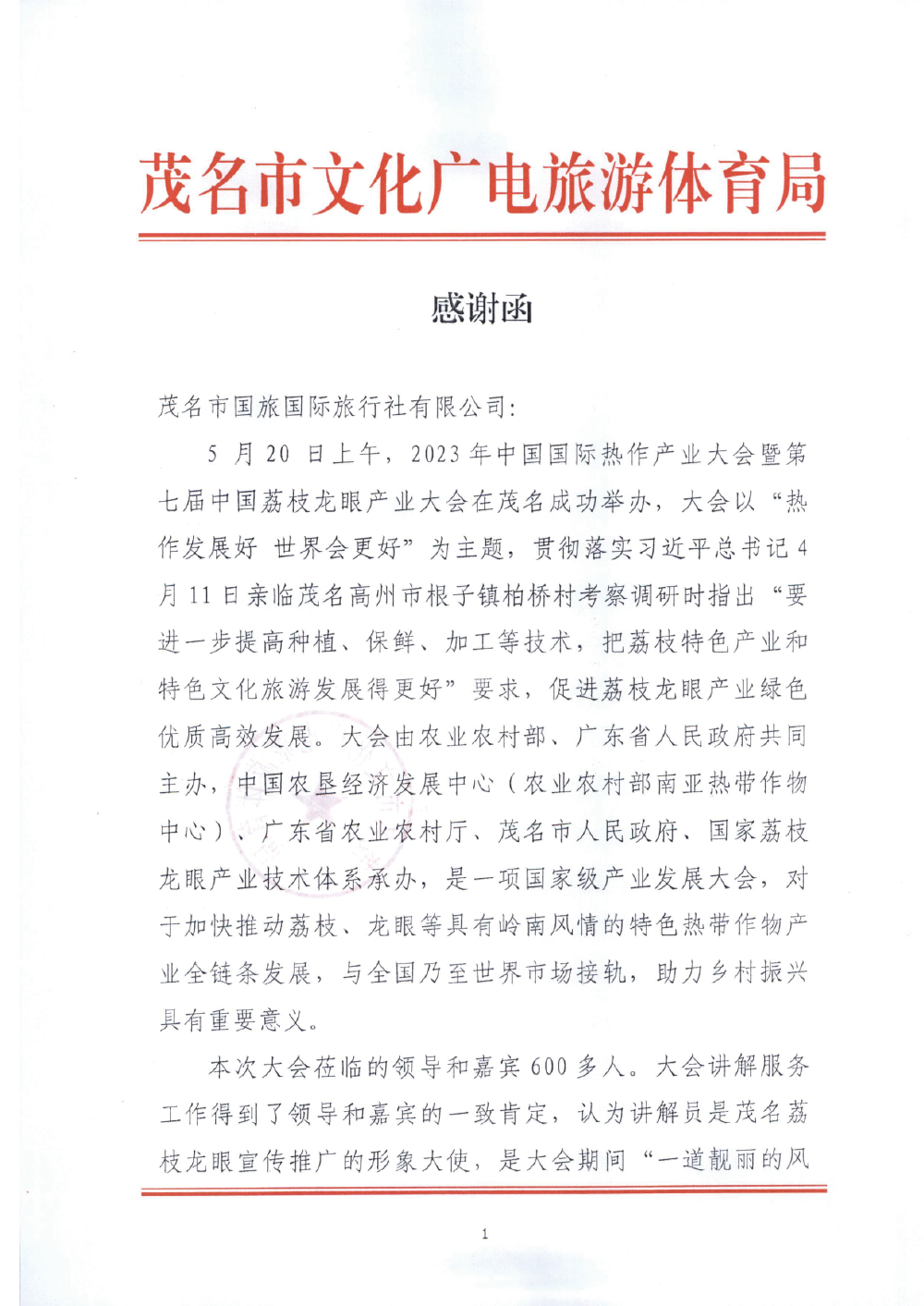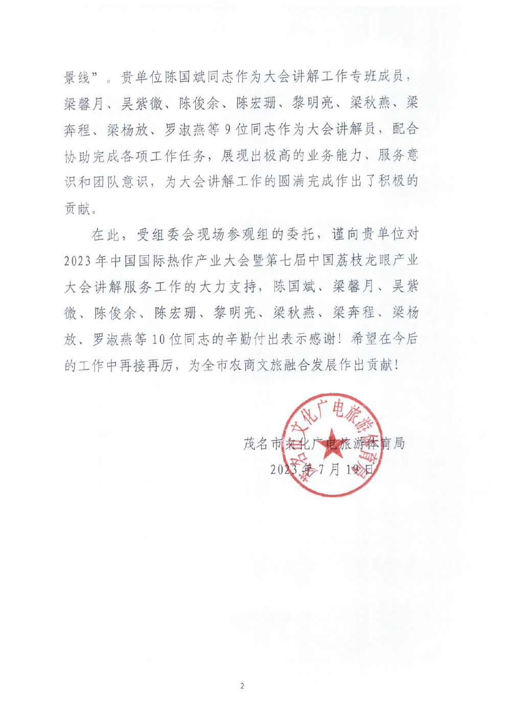 后記:大會(huì)結(jié)束后,受組委會(huì)現(xiàn)場(chǎng)參觀組的委托,為感謝我單位對(duì)2023年中國(guó)國(guó)際熱作產(chǎn)業(yè)大會(huì)暨第七屆中國(guó)荔枝龍眼產(chǎn)業(yè)大會(huì)講解服務(wù)工作的大力支持,感謝我社派出的9名講解員在大會(huì)期間配合協(xié)助完成各項(xiàng)工作任務(wù),展現(xiàn)出極高的業(yè)務(wù)能力、服務(wù)意識(shí)和團(tuán)隊(duì)意識(shí),為大會(huì)講解工作的圓滿完成作出了積極的貢獻(xiàn)。茂名市文化廣電旅游體育局特此致函向我社表?yè)P(yáng)和感謝。