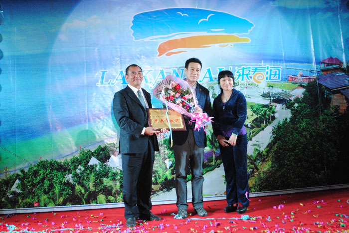 茂名國(guó)旅董事長(zhǎng)費(fèi)明龍、放雞島董事長(zhǎng)陳明哲為獲得杰出合作組團(tuán)社的中國(guó)國(guó)旅總社頒獎(jiǎng)