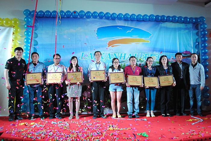 茂名國(guó)旅總經(jīng)理吳卡達(dá)、董事李泓希、放雞島總經(jīng)理陳信豪為柳州國(guó)旅等七個(gè)單位頒發(fā)最佳合作組團(tuán)社獎(jiǎng)