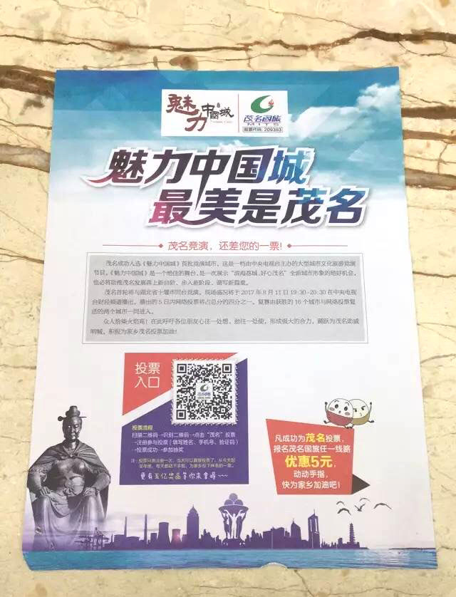 競(jìng)演投票的時(shí)間,就是暑期旺季,茂名國(guó)旅預(yù)計(jì)今年暑期組接游客6萬(wàn)人次,為了挖掘這一寶貴而獨(dú)家的票倉(cāng),我們?cè)O(shè)計(jì)印制了32開(kāi)彩頁(yè)30000張,并編寫(xiě)了固定話術(shù),要求導(dǎo)游必須在團(tuán)上向游客發(fā)放彩頁(yè)并發(fā)動(dòng)團(tuán)內(nèi)游客投票,此項(xiàng)工作要求收集影像并做考核,以確保執(zhí)行到位;另外,我們制作10000張宣傳投票的單面彩色紙張,前臺(tái)以此做為給游客打印參考行程時(shí)的紙張,提醒游客不忘投票。同時(shí),茂名國(guó)旅制作10條“為茂名加油、為茂名投票”等不同內(nèi)容的橫幅,供外地游客在茂名景區(qū)、酒店合影,為投票造勢(shì);據(jù)統(tǒng)計(jì),至7月23日止,茂名國(guó)旅及關(guān)聯(lián)企業(yè)員工、親屬與游客,已為茂名投票約12萬(wàn)張。
