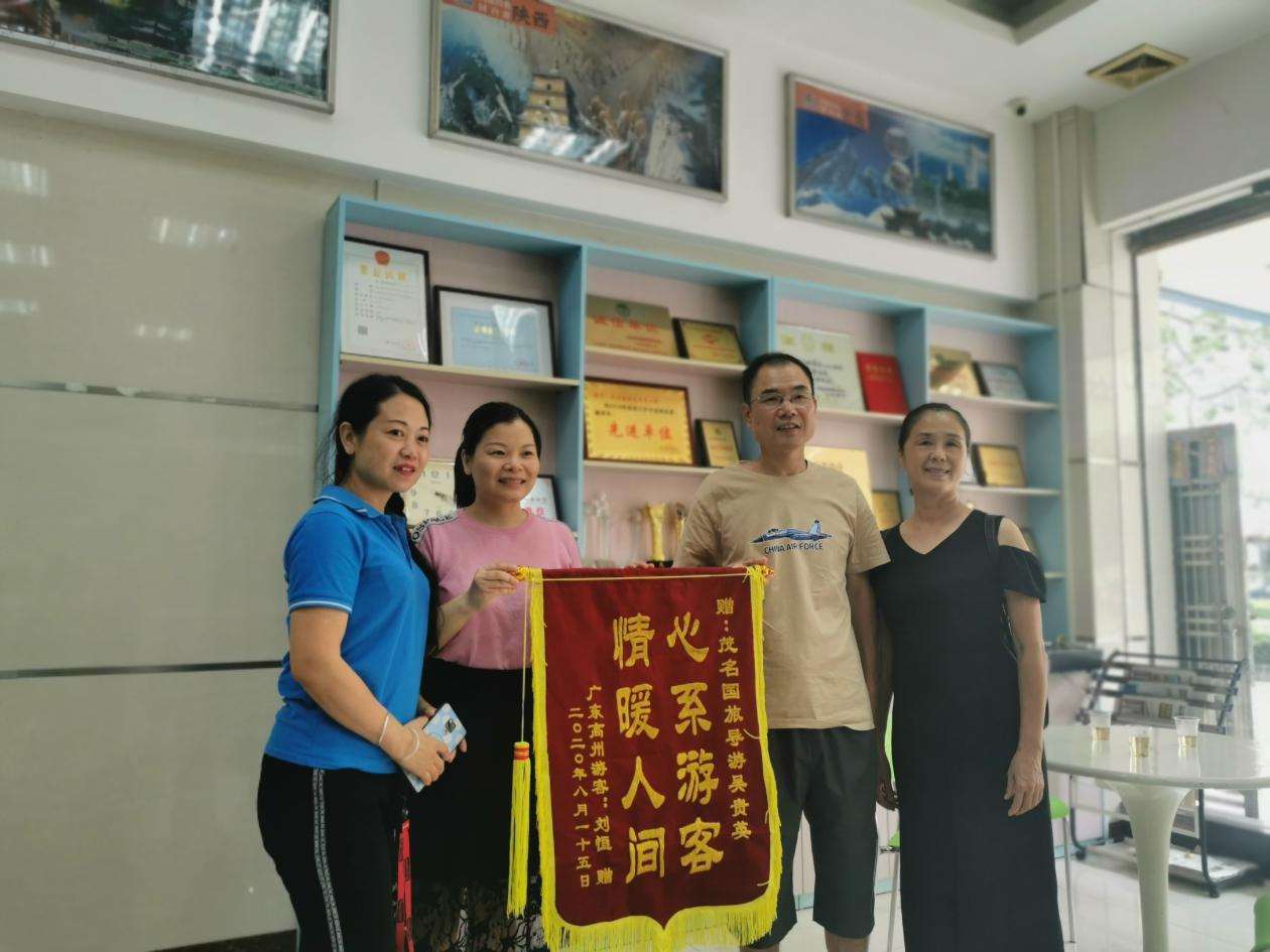 ▲8月17日,茂名國旅優(yōu)秀導游吳貴英獲得 昆明回來的客人贈送的錦旗。