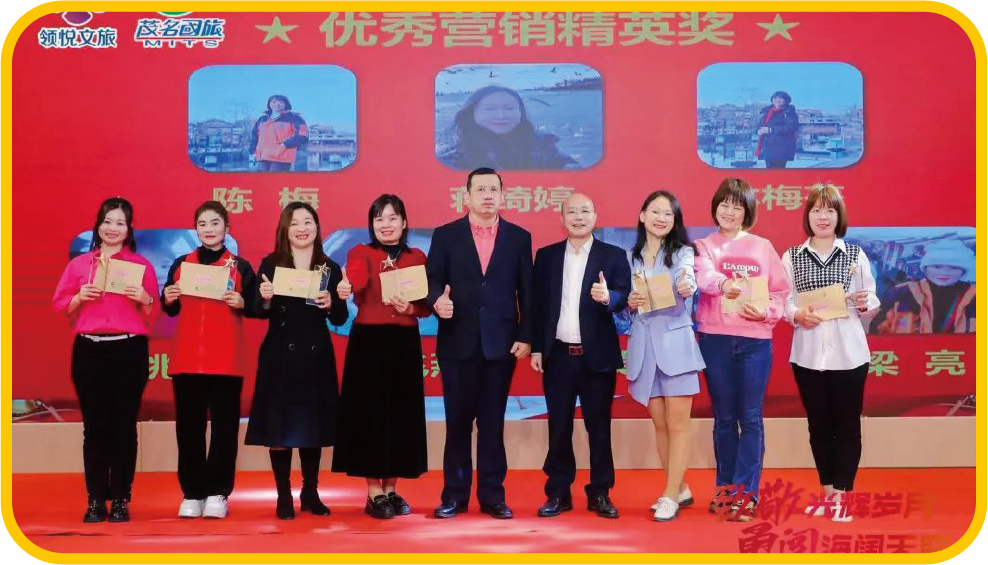茂名國(guó)旅助理總經(jīng)理董德強(qiáng)、茂名新領(lǐng)粵傳媒有限公 司總經(jīng)理高蘭為林丹丹、劉付瑋、李瑩、劉晶晶、 范嬋、鄭海棠、鄭小梅、李欣宇、吳翠玲、陳海斌、 梁小花頒發(fā)營(yíng)銷(xiāo)精英獎(jiǎng)