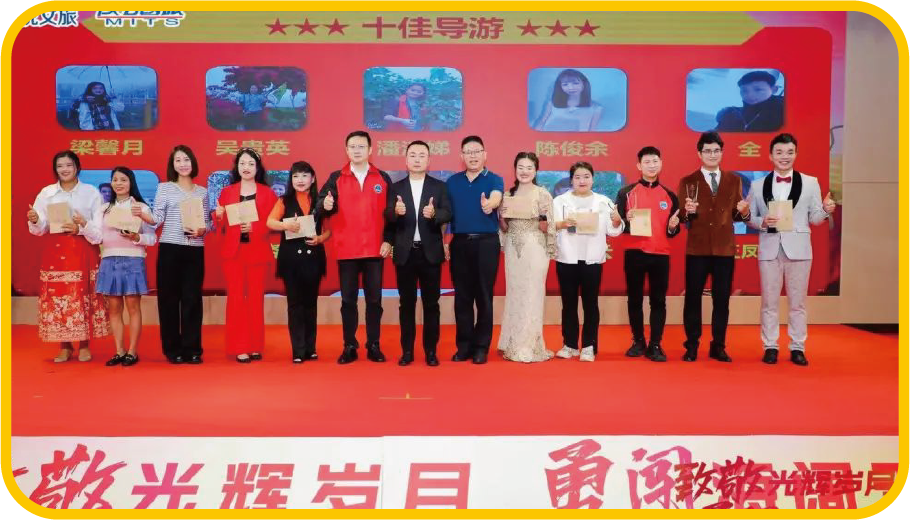 茂名國(guó)旅執(zhí)行董事李泓希、總經(jīng)理吳卡達(dá)、副總 經(jīng)理陳國(guó)斌為梁馨月、吳貴英、潘江娣、陳俊余、 何全、朱時(shí)龍、方曉、黃洋星、龐曉云、李玉鳳 頒發(fā)2023年度十佳導(dǎo)游獎(jiǎng)
