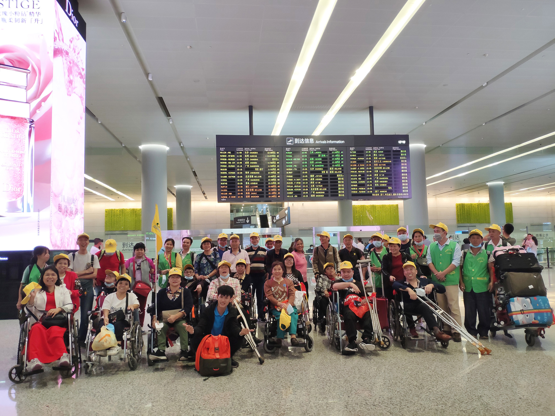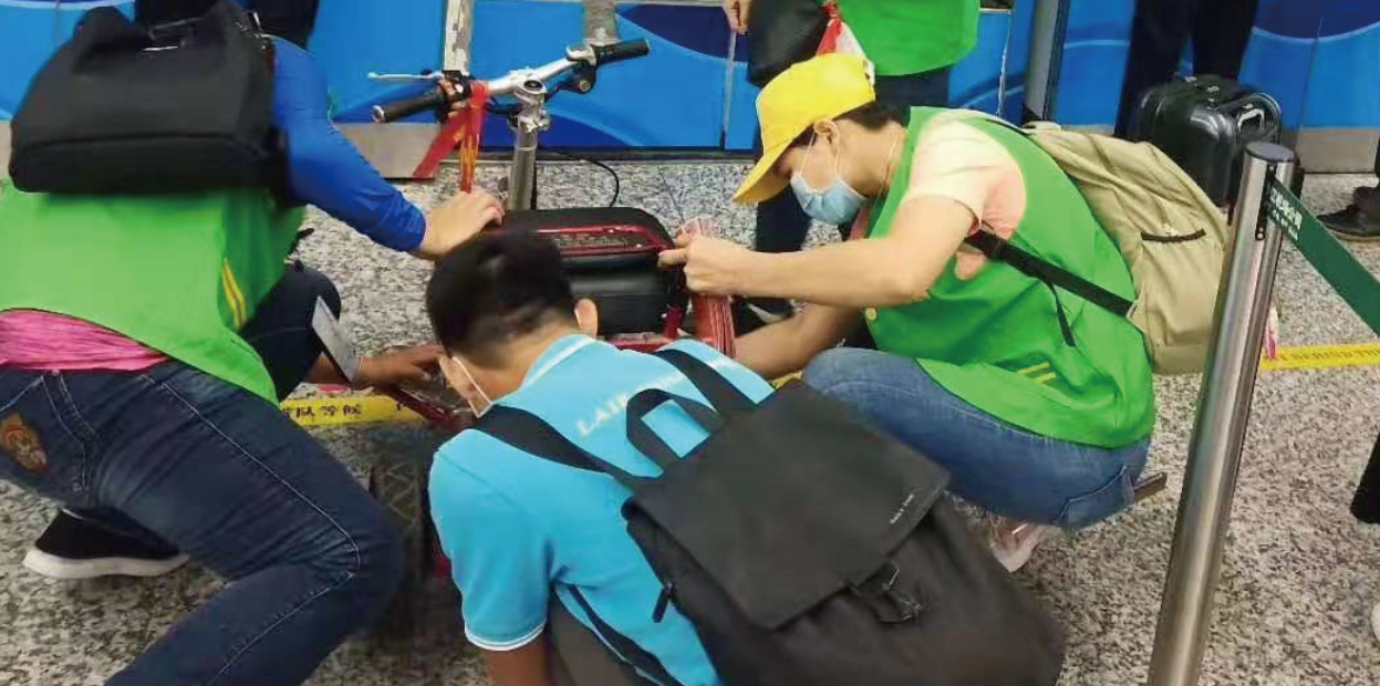 可剛一到飛機場,困難就一個又一個接踵而來。由于疫情防控需要提供每個人的健康碼,可拿起殘疾人的手機時,何全和蕭海鋒傻了,這個手機沒用過,是盲人手機,全憑手感按鍵操作,眼看著后面排起了長隊,兩個年輕的小伙子急的滿頭大汗,還好在盲人和義工的幫助下,將健康碼調(diào)出及時進入大廳??蛇@時,問題又來了,殘疾人自己的輪椅要辦理托運,可機場自有的輪椅數(shù)量遠遠不夠,義工們只能是抱著、背著殘疾人候機,何全和蕭海鋒像兩只熱鍋上的螞蟻,一邊不斷聯(lián)系機場方提供幫助和綠色通道,一邊辦理登機和托運手續(xù),在最短的時間里和機場協(xié)調(diào)出了一塊休息區(qū)。同時,他倆爭取到了特殊政策,讓殘疾人們乘坐自己的輪椅登機后,再將輪椅補辦托運......平日里輕車熟駕的登機流程,這回給兩個初生牛犢不怕虎的年輕人折騰得夠嗆!