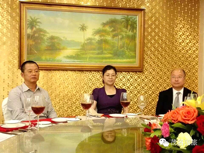 茂名市旅游局黨組書記、局長梁紅?。ㄖ校?,茂名市旅游協(xié)會常務(wù)副會長陳中波(左)