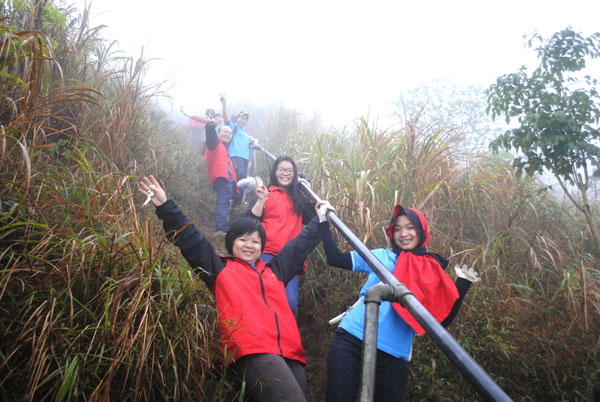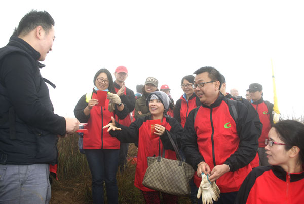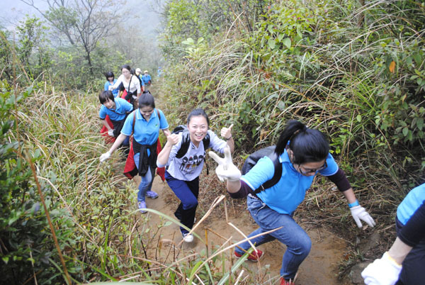 我社員工帶著準備好的行囊,腳踏著古老的登山道,結(jié)伴前行,相互幫助,攀登在崢嶸嶙峋的山石、潺潺作響的山溪之間,雖一路山高路險、冷雨寒風(fēng),但全體員工依然克服重重困難、挑戰(zhàn)體能極限登頂成功,體現(xiàn)了一番“一覽眾山小”的壯志豪情。在身體得到鍛煉的同時,長假之后的疲憊也被一掃而空。最后經(jīng)比賽裁判委員會裁決,導(dǎo)游部張鳴、謝玉分別榮獲男女個人獎第一名,公司財務(wù)部和網(wǎng)絡(luò)營銷部榮獲團體組別第一名。簡約的頒獎儀式后,經(jīng)費明龍董事長提議,大家把山頂上遺留的新舊垃圾裝進垃圾袋帶下山。迷霧寒風(fēng)里,精疲力盡時,國旅人不忘環(huán)保公益,大家爭先恐后,俯身撿垃圾,燦爛的笑容,忙碌的身影,成為了浮山山頂一道亮麗的風(fēng)景線。