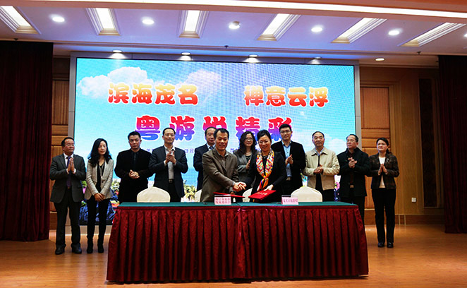 茂名市旅游局局長梁紅健與當?shù)芈糜尾块T簽訂戰(zhàn)略合作協(xié)議。