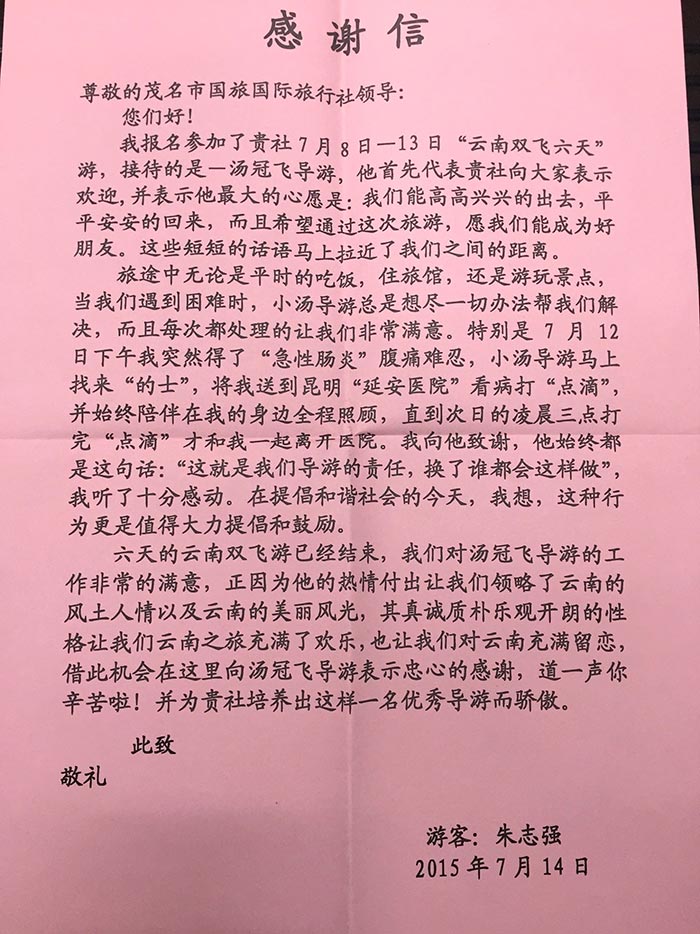 客戶服務中心楊經理在報告中指出,強化執(zhí)行工作流程標準是確保團隊質量、提升客戶滿意度、超越客戶期望值的關鍵基礎點,在全體員工的共同努力下,2015年暑期公司共接待游客52011人次,團隊1000多個,接待游客的滿意度達到98%。暑期旺季,導游部較好地完成了公司的帶團任務,其中涌現(xiàn)出一批象何金波、蔡俊茂、吳貴英、張鳴、林麗萍、黃冰等表現(xiàn)出色的優(yōu)秀導游,他們以專業(yè)細致、真誠服務感動著萬千游客,贏得了廣大市民游客的普遍稱贊和一致好評。