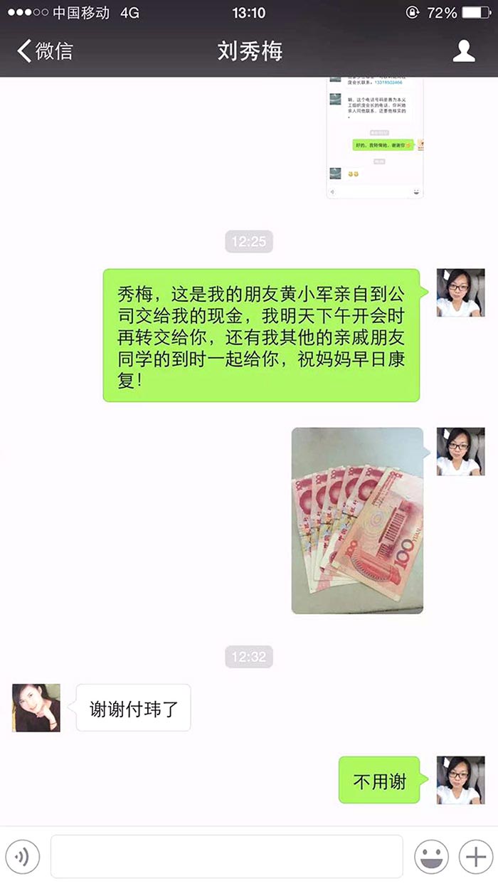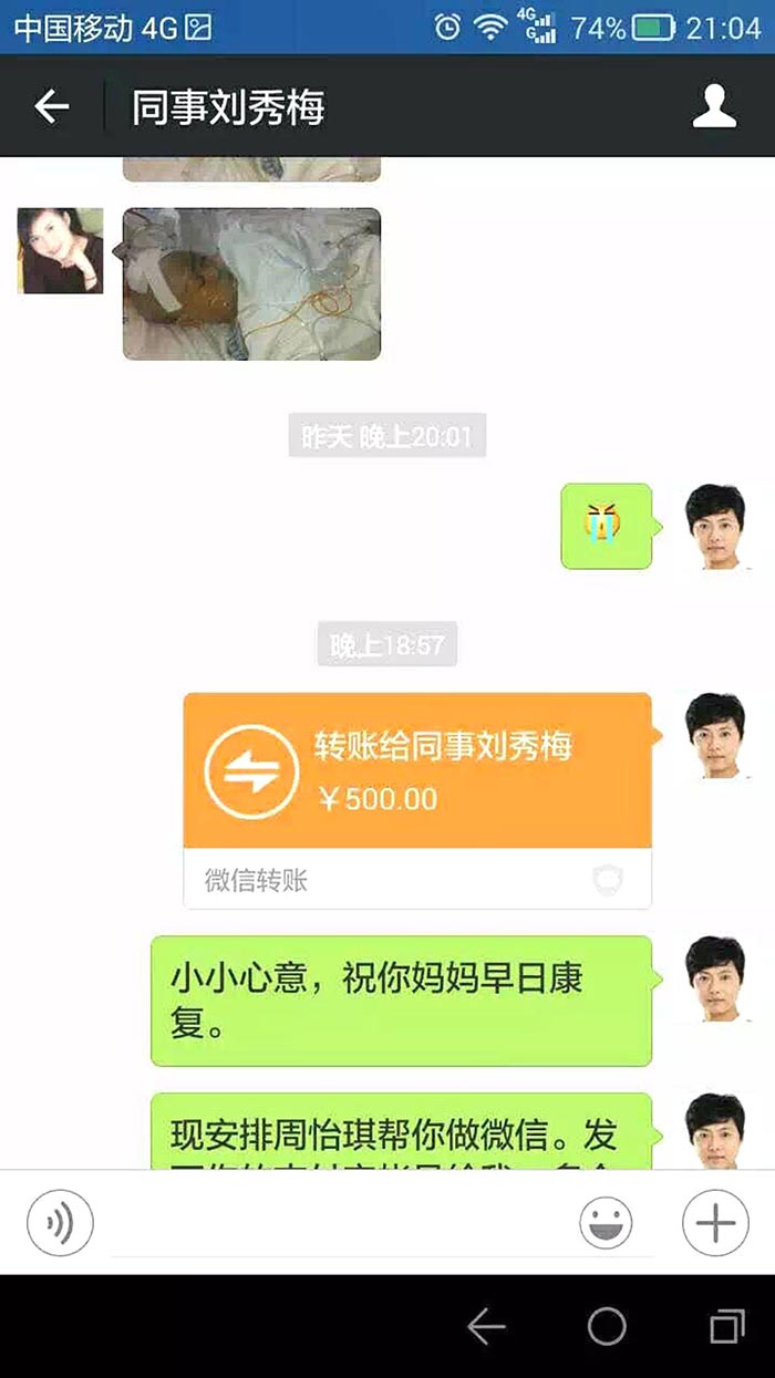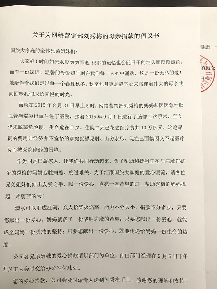 一方有難,八方支援。同是國旅人,劉秀梅的家人就是我們國旅人的家人,有困難我們一起來共同面對、共同解決。公司董事長費民龍、總經(jīng)理吳卡達了解情況后,第一時間通知公司辦公室發(fā)出捐款倡議,并要求通過微信平臺發(fā)動國旅家人的微信好友來共同參加此次愛心捐款活動。