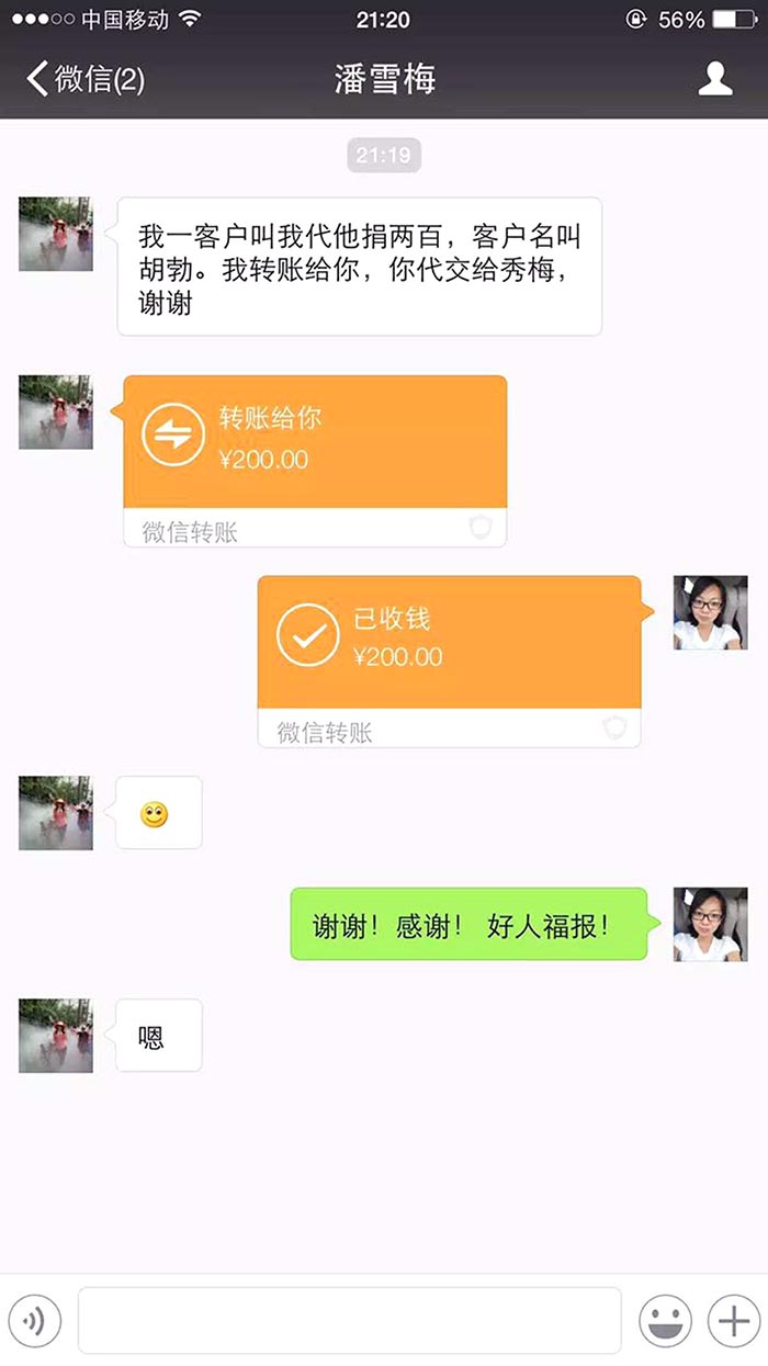 捐款倡議發(fā)出后,茂名國旅這個大家庭持續(xù)呈現(xiàn)著令所有國旅人感動的一幕幕。國旅員工除了踴躍捐款外,還積極發(fā)動親朋好友捐款,短短兩天,國旅辦公室就籌得善款40000多元(其中現(xiàn)金2萬元、微信紅包2萬多元)。國旅人以積極行動踐行了茂名國旅是一個“溫暖可愛的大家庭”的企業(yè)文化。此次捐款活動,除了公司員工慷慨解囊外,最令我們感動的是,包括國旅忠實客戶在內的社會各界人士積極參與,點滴仁愛之心匯成一股股暖流,傳遞著愛的力量和生命的熱度,讓劉秀梅家庭看到了希望的曙光。