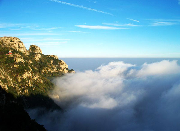 泰山云霧可謂呼風喚雨,變幻無窮:時而山風呼嘯,云霧彌漫,如墜混沌世界;時而黑云壓城,地底興雷,讓人魂魄震動,游人遇此,無須失望,因為你將要見到云海玉盤的奇景:有時白云滾滾,如浪似雪;有時烏云翻騰,形同翻江倒海;有時白云一片,宛如千里棉絮;有時云朵填谷壑,又象連綿無垠的汪洋大海,而那座座峰巒恰似海中仙島。站在岱頂,俯瞰下界,可見片片白云與滾滾烏云而融為一體,匯成滔滔奔流的“大?!保钊M生,又令人心潮起伏。