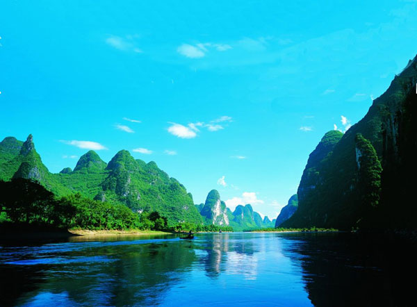 陽朔漓江景區(qū)是到桂林旅游的必游線路,它是漓江風(fēng)景的精華所在。這一帶的江水清澄見底,宛如羅帶的漓江蜿蜒于蒼翠雄奇的群山之間,因此有了“百里漓江,百里畫廊”的稱譽。江邊名山密集、千姿百態(tài)、翠竹叢叢,村落屋宇掩映在綠樹叢中,構(gòu)成一幅美麗的山水長軸,宛若一道千回百轉(zhuǎn)的畫廊??h境自楊堤冠巖村順江而下,主要景點有:桃源仙境、浪石勝境、仙人推磨、繡山彩壁、鴛鴦戲水、九馬畫山、七姐下凡、螺螄山等二十多處。乘舟游覽,放眼望去,湛藍明媚的天空下,遠方黛色連綿的山、水旁郁郁蔥蔥的樹、樹下閑適慵懶的人、水中散漫遐意的牛、還有水底搖弋多姿的草,構(gòu)成一副生動曼妙的畫卷,好似遨游仙宮,正是“分明看見青山頂,船在青山頂上行”,如夢如幻。