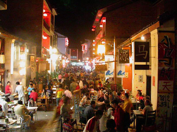 西街最誘人是在夜晚,酒吧文化是夜晚西街的主流文化。華燈初上,站在街口望去,霓虹閃爍,炫耀著它“包裹”著的中文或英文招牌,向熙熙攘攘的人群明送秋波。木質(zhì)的高腳桌椅、昏黃的燈光、熱烈的骰子、長發(fā)披肩自彈自唱的樂手,組成了讓人盡情宣泄的紙醉金迷的氛圍。