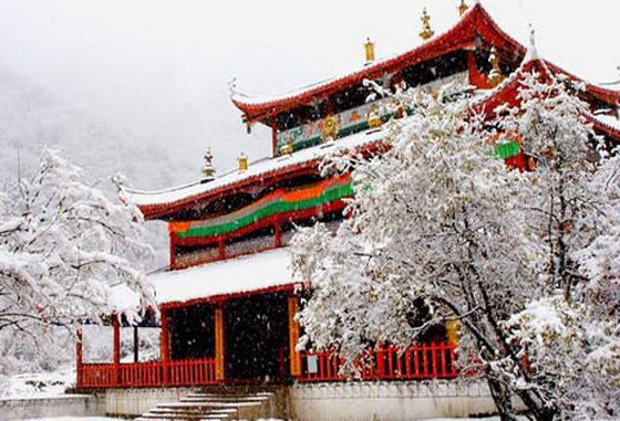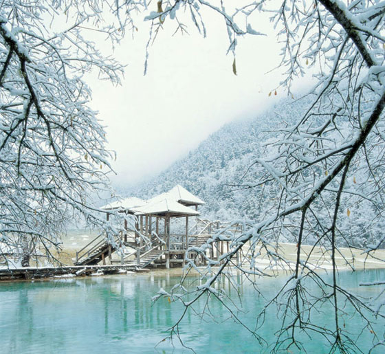 九寨溝景觀五絕之一的雪峰,在藍(lán)天的映襯下放射出耀眼的光輝,像英勇的武士,整個(gè)冬季守候在九寨溝的身旁。站在遠(yuǎn)處凝望,山嶺峰谷這時(shí)都變得白雪皚皚、銀裝素裹,雪線以下的林濤樹海則繼續(xù)穿著秋的盛裝?;鸺t的楓葉,翠綠的松柏、金黃的樺樹林與藍(lán)天白云、皚皚雪峰、翠海飛瀑交相輝映。森林雪域相襯,溝谷縱橫交錯(cuò),湖溪綠樹倒影,瀑布倒掛層疊。九寨溝的初冬,就如藝術(shù)大師精心繪出的一幅幅絕倫無比的經(jīng)典畫作,讓你不敢相信眼前美景的真實(shí)。