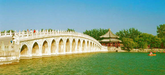頤和園原是帝王的行宮和花園,面積達290公頃,主要由昆明湖、萬壽山和后山后湖三部分組成。這座巨大的園林依山面水,昆明湖約占全園面積的3/4,整個園林以萬壽山上的佛香閣為中心,根據(jù)不同地點和地形,配置了殿、堂、樓、閣、廊、亭等精致的建筑。萬壽山上依山而建的佛香閣、銅亭,臨湖畔建的千米長畫廊、昆明湖中的十七孔橋和石舫等都是游人必到的景點。