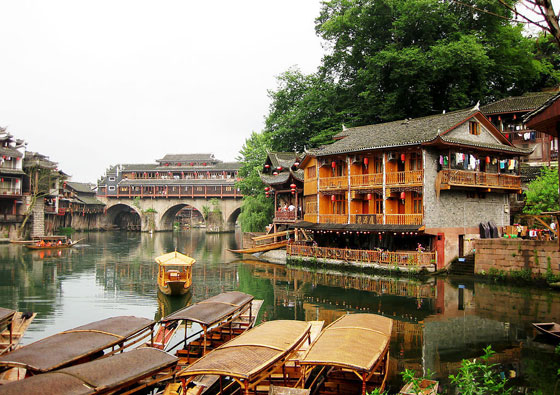 虹橋橫臥于沱江之上,風雨樓以它的壯觀和俊美拔然而起,這其實就是成了一道重疊的風景,這道風景,由下而上、由古而今穿越著六百多年的歷史。順水而下,穿過虹橋,一幅江南水鄉(xiāng)的畫卷便展現(xiàn)于眼前:萬壽宮、萬名塔、奪翠樓,岸歷經(jīng)風雨的土家吊腳樓,檐下飄動的藍色蠟染……水映山,山映樓,一種遠離塵世的感覺悠然而生,更恍惚似進入清新雋永、淡泊高雅的水墨丹青畫卷。