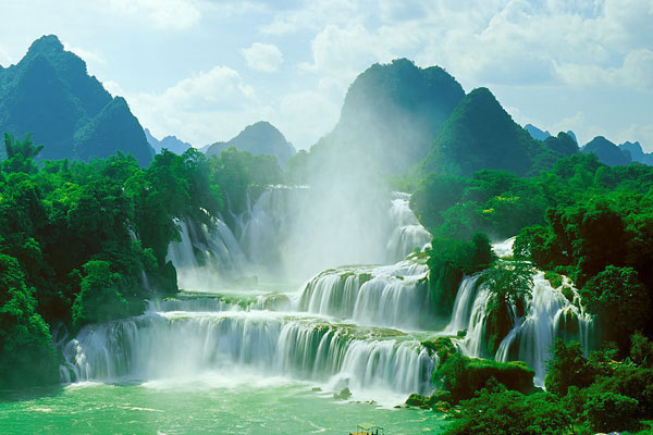 山水畫廊云集國家特級景點(diǎn)及一二三級景點(diǎn)40余個。國家特級景點(diǎn)德天瀑布?xì)鈩莅蹴?,與緊鄰的越南板約瀑布相連,是世界第二大跨國瀑布。德天瀑布位于大新縣歸春河的上游,距中越邊境53號界碑約50米。清澈的歸春河是左江的支流,也是中越邊境的國界河,德天瀑布則是它流經(jīng)浦湯島時的杰作。浩浩蕩蕩的歸春河水,從北面奔涌而來,高崖三疊的浦湯島,巍然聳峙,橫阻江流,江水從高達(dá)50余米的山崖上跌宕而下,撞在堅(jiān)石上,水花四濺,水霧迷朦,遠(yuǎn)望似縞絹垂天,近觀如飛珠濺玉,透過陽光的折射,五彩繽紛,那嘩嘩的水聲,振蕩河谷,氣勢十分雄壯。瀑布寬100多米,縱深60多米,落差近50米,三級跌落,氣勢磅礴,蔚為壯觀。大瀑布屬于中國,由上分三層跌宕而下,在瀑布下端跟歸春河相接的地方,飄起一層層薄薄的水氣,如煙如霧,飄飄渺渺。小瀑布屬于越南。如果把大瀑布比作一個粗獷的男子,那么小瀑布就是一個娟秀的女子。她雖然沒有大瀑布那么氣勢磅礴,但是溫柔的映襯在旁邊也別一番風(fēng)味。