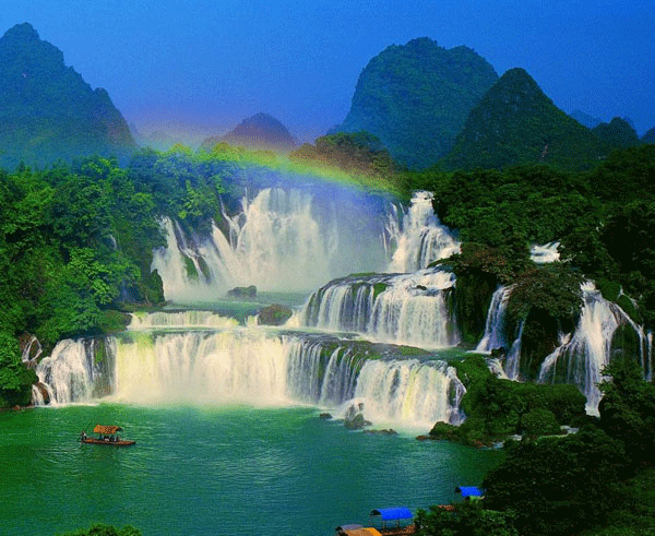 瀑布景觀隨河水流量的多寡而變化,河水有季節(jié)變化,瀑布亦因而有四季景色。春天來臨,崖草泛青,山花吐蕊,木棉花盛開,歸春河兩岸一片紅霞,不是秋色,勝似秋色。在紅花萬朵叢中,德天瀑布猶如一匹銀色素潔的白練,輕盈歡快地舞蹈著,夏季,則山洪始發(fā),洪流滾滾,水聲隆隆,如萬馬奔騰,鳴金擊鼓,震撼山谷。此時,若解衣脫鞋,躍入水中游玩,看眼前之飛舞銀龍,噴吐著水珠云霧在自己體上頭頂,不僅消暑避炎,而且若置仙境之中,其樂無窮。