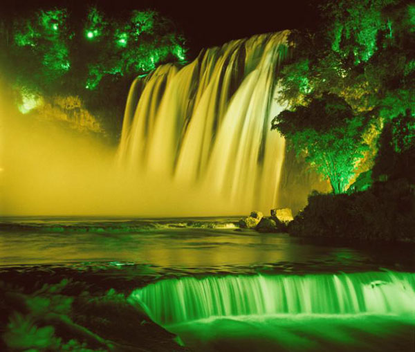 黃果樹瀑布激起的水花,如雨霧般騰空而上,隨風(fēng)飄飛,漫天浮游,高達數(shù)百米,落在瀑布右側(cè)的黃果樹小鎮(zhèn)上,特別是艷陽高照之日,水霧蒙蒙,映出金色的光來,似真似幻,那街道似乎是金色大街,形成了遠近聞名的“銀雨灑金街”的奇景。