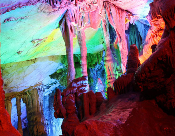 而位于春灣鎮(zhèn)的通天蠟燭,從山水相依,湖岸垂柳依依的明鏡中破水而出,直上藍(lán)天。它高七十余米,酷似一支豎著的蠟燭,四緣附著一團(tuán)團(tuán)、一塊塊的石塊,像凝固的蠟液,頂端上的小石柱,則酷似蠟燭的燭芯。走盡柳堤,進(jìn)入一條石徑,這里是觀賞通天蠟燭的最佳位置。早上,太陽(yáng)剛爬上半山腰,霞光穿過(guò)石縫,無(wú)數(shù)道光柱射到霧氣蒸騰的湖面上,通天蠟燭戴上一個(gè)霞環(huán),變得瑩瑩發(fā)光。太陽(yáng)升高后,天地明朗,湖面碧綠如境,景色同樣迷人。在通天蠟燭的東南面,有“百頁(yè)劍門(mén)”、“仙人過(guò)坳”、“劉三姐歌臺(tái)”等許多景觀。